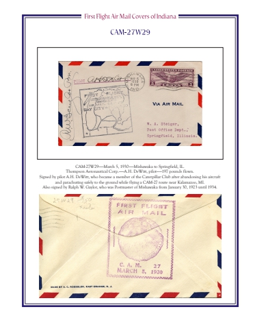 CAM-27W29%u2014%u2014March 5, 1930%u2014%u2014Mishawaka to Springfield, IL.Thompson Aeronautical Corp.%u2014%u2014A.H. DeWitt, pilot%u2014%u2014197 pounds flown.Signed by pilot A.H. DeWitt, who became a member of the Caterpillar Club after abandoning his aircraft and parachuting safely to the ground while flying a CAM-27 route near Kalamazoo, MI.Also signed by Ralph W. Gaylor, who was Postmaster of Mishawaka from January 30, 1923 until 1934.