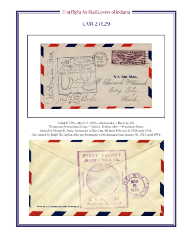 CAM-27E29%u2014%u2014March 5, 1930%u2014%u2014Mishawaka to Bay City, MI.Thompson Aeronautical Corp.%u2014%u2014John L. Huber, pilot%u2014%u201444 pounds flown.Signed by Homer E. Buck, Postmaster of Bay City, MI from February 8, 1928 until 1936.Also signed by Ralph W. Gaylor, who was Postmaster of Mishawaka from January 30, 1923 until 1934.