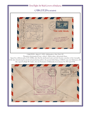 CAM-27E29%u2014%u2014March 5, 1930%u2014%u2014Mishawaka to New York, NY.Thompson Aeronautical Corp.%u2014%u2014John L. Huber, pilot%u2014%u201444 pounds flown.Signed by a different pilot, A.H. DeWitt, who flew the westbound route, and who became a member of the Caterpillar Club after abandoning his aircraft and parachuting safely to the ground while flying a CAM-27 route near Kalamazoo, MI.Also signed by Ralph W. Gaylor, who was Postmaster of Mishawaka from January 30, 1923 until 1934.