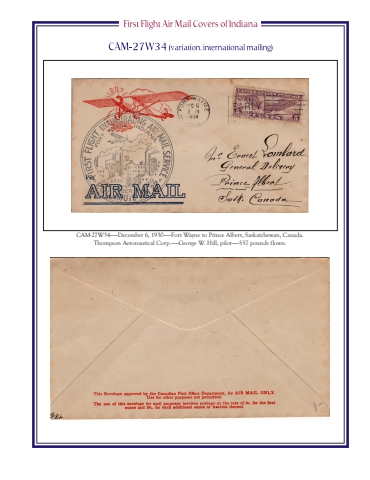 CAM-27W34%u2014%u2014December 6, 1930%u2014%u2014Fort Wayne to Prince Albert, Saskatchewan, Canada.Thompson Aeronautical Corp.%u2014%u2014George W. Hill, pilot%u2014%u2014557 pounds flown.