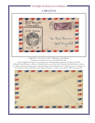 CAM-27E36%u2014%u2014December 6, 1930%u2014%u2014Mishawaka to Fort Wayne.Thompson Aeronautical Corp.%u2014%u2014George W. Hill, pilot.Signed by Ralph W. Gaylor, who was Postmaster of Mishawaka from January 30, 1923 until 1934. Addressee, Leon Berman, a collector of Lindberg covers, was active in the American Air Mail Society as early as the 1930s, and was elected president of Detroit%u2019s Motor City Air Mail Society in 1957. He was also a member of the American Topical Association and collected elephants on stamps. Leon died in 2001 at the age of 92.