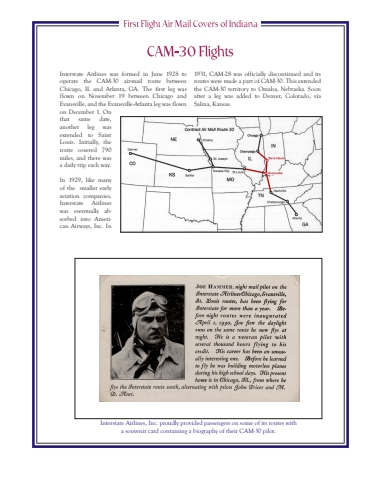 Interstate Airlines was formed in June 1928 to operate the CAM-30 air-mail route between Chicago, IL and Atlanta, GA. The first leg was flown on November 19 between Chicago and Evansville, and the Evansville-Atlanta leg was flown on December 1. On that same date, another leg was extended to Saint Louis. Initially, the route covered 790 miles, and there was a daily trip each way. In 1929, like many of the smaller early aviation companies, Interstate Airlines was eventually absorbed into American Airways, Inc. In 1931, CAM-28 was officially discontinued and its routes were made a part of CAM-30. This extended the CAM-30 territory to Omaha, Nebraska. Soon after a leg was added to Denver, Colorado, via Salina, Kansas.Interstate Airlines, Inc. proudly provided passengers on some of its routes with a souvenir card containing a biography of their CAM-30 pilot.