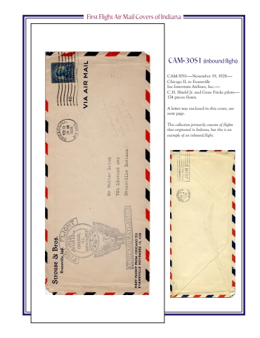 CAM-30S1%u2014%u2014November 19, 1928%u2014%u2014Chicago IL to EvansvilleInc.Interstate Airlines, Inc.%u2014%u2014C.H. Shield Jr. and Gene Fricks pilots%u2014%u2014174 pieces flown.A letter was enclosed in this cover, see next page.This collection primarily consists of flights that originated in Indiana, but this is an example of an inbound flight.