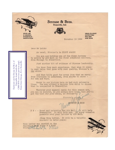 Enclosure sent by Strouse & Bros. of Evansville found inside the CAM-30S1 cover (see previous page), flown from Chicago, IL to Evansville.