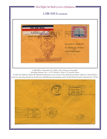 CAM-30S3%u2014%u2014November 19, 1928%u2014%u2014Terre Haute to Evansville.Interstate Airlines, Inc.%u2014%u2014C.H. Shield Jr., pilot%u2014%u201425 pounds flown. In 1931, the addressee, Robert W. Meinhoff, advertised a cover service in the Airpost Journal where collectors could send him covers for upcoming air-mail events that were self-addressed and stamped, and he would obtain the pilot%u2019s signature for a 15%u00a2 fee.