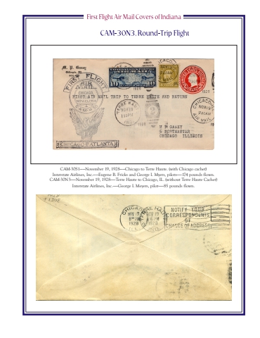 CAM-30S1%u2014%u2014November 19, 1928%u2014%u2014Chicago to Terre Haute. (with Chicago cachet)Interstate Airlines, Inc.%u2014%u2014Eugene B. Fricks and George I. Myers, pilots%u2014%u2014174 pounds flown.CAM-30N3%u2014%u2014November 19, 1928%u2014%u2014Terre Haute to Chicago, IL. (without Terre Haute Cachet)Interstate Airlines, Inc.%u2014%u2014George I. Meyers, pilot%u2014%u201485 pounds flown.