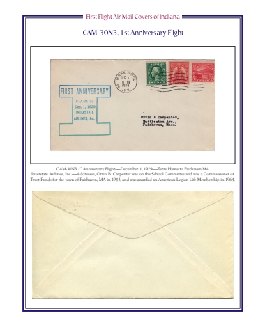 CAM-30N3 1st Anniversary Flight%u2014%u2014December 1, 1929%u2014%u2014Terre Haute to Fairhaven MAInterstate Airlines, Inc.%u2014%u2014Addressee, Orrin B. Carpenter was on the School Committee and was a Commissioner of Trust Funds for the town of Fairhaven, MA in 1943, and was awarded an American Legion Life Membership in 1964.