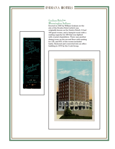 Erected in 1929 by William Graham on the site of the Bowles Hotel (which was originally known as the Gentry Hotel). It had 100 guest rooms, and a banquet room with a seating capacity for 200 that was lighted with crystal chandeliers. There was another dining room on the second floor with seating for 120, and 85% of the rooms included baths. Restored and converted into an office building in 1979 by the Cook Group.
