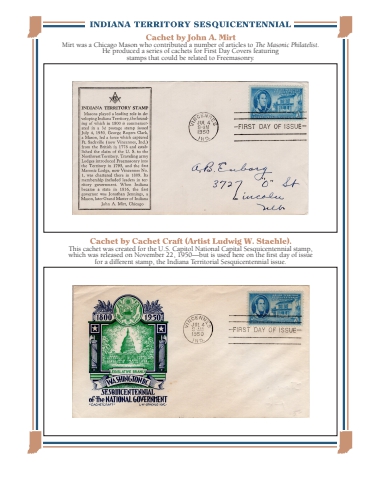 Mirt was a Chicago Mason who contributed a number of articles to The Masonic Philatelist. He produced a series of cachets for First Day Covers featuring stamps that could be related to Freemasonry.This cachet was created for the U.S. Capitol National Capital Sesquicentennial stamp, which was released on November 22, 1950%u2014but is used here on the first day of issue for a different stamp, the Indiana Territorial Sesquicentennial issue.