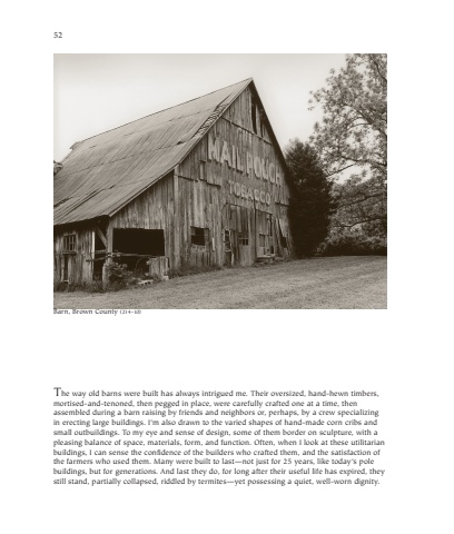 52Barn, Brown County (214-10)The way old barns were built has always intrigued me. Their oversized, hand-hewn timbers, mortised-and-tenoned, then pegged in place, were carefully crafted one at a time, then assembled during a barn raising by friends and neighbors or, perhaps, by a crew specializing in erecting large buildings. I%u2019m also drawn to the varied shapes of hand-made corn cribs and small outbuildings. To my eye and sense of design, some of them border on sculpture, with a pleasing balance of space, materials, form, and function. Often, when I look at these utilitarian buildings, I can sense the confidence of the builders who crafted them, and the satisfaction of the farmers who used them. Many were built to last%u2014not just for 25 years, like today%u2019s pole buildings, but for generations. And last they do, for long after their useful life has expired, they still stand, partially collapsed, riddled by termites%u2014yet possessing a quiet, well-worn dignity.