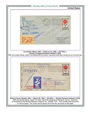 Rocket Mail of the WorldUnited StatesLincolnville, Maine, USA %u2014 February 21, 1960 %u2014 EZ-30C2 %u2014 Society of Applied Rocketry (SOAR) (1,600).With one rocket stamp, imperf. Numbered 2618 on back. Launches were also carried out on the next day.Storey County, Nevada, USA %u2014 March 25, 1960 %u2014 EZ-32C4 %u2014 Rocket Research Institute (1,000).With one rocket stamp, imperf. On back: facsimile signatute of George S. James, Chairman of the Board of the Rocket Research Institute, Inc., and No. 7231. Four rockets were launched on this occasion. This cover was for launch #4 of the four launches on this date.