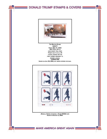 MAKE AMERICA GREAT AGAINDONALD TRUMP STAMPS & COVERSTHE BOSTON GLOBEGUILTYFRIDAY MAY 31, 2024NEW YORK JURY INHUSH MONEY TRIAL FINDSTRUMP GUILTY ON ALL 34COUNTS, MAKING HIM THEFIRST FORMER PRESIDENT TOBECOME A FELON.CONVICTEDISSUED ON JULY 26, 2024, BUT NEVER OFFERED FOR SALE.(KAMALA HARRIS CRUSHING A TRUMP MAGA HAT)ISSUED ON AUGUST 2, 2024.